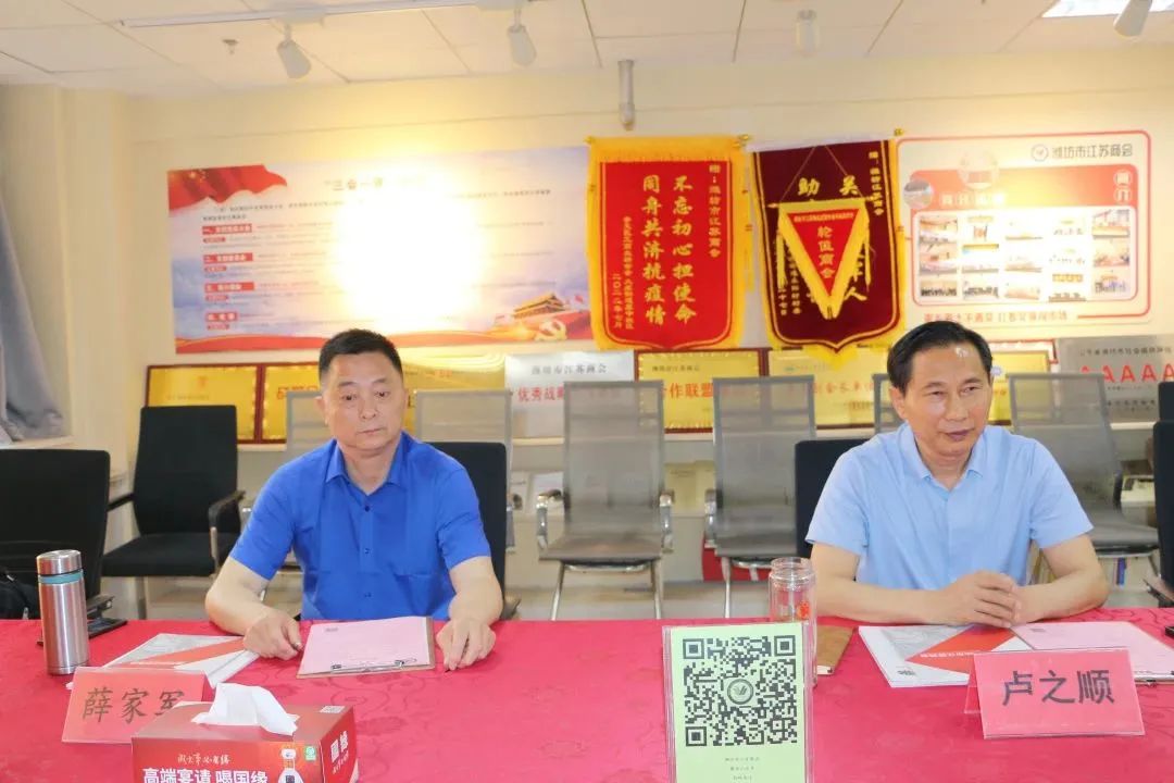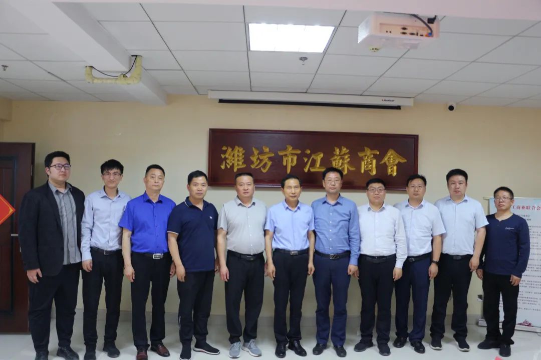 6月6日下午,中共盐城市委副秘书长邓小锋带队到江苏商会考察调研,潍坊市江苏商会会长卢之顺组织座谈,中共盐城市委办公室副主任陈建,射阳县委副书记、县委党校校长孙庆树,中共盐城市委办党群处处长宗磊,二级主任科员、副处长杨勇,副处长殷文鑫,射阳县委办公室综合二科副科长陈夕松,江苏商会执行会长赵永和、常务副会长娄正喜、薛家军参加交流。