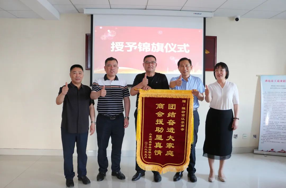 6月10日,江苏商会收到了一份特别的礼物,这是由副会长俞伟林单位“山东硕昌食品有限公司”赠送的写有“团结奋进大家庭,商会援助显真情”的锦旗,感谢商会对会员单位遇到的困难给予帮助和解决,为企业排忧解难、化解纠纷,维护了会员企业合法权益。