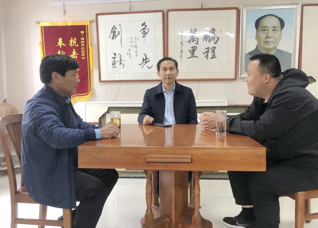 5月5日,临朐县九山镇褚庄社区党委书记孙长富、褚庄村党支部书记付少春到商会走访交流,潍坊市人大代表、商会会长卢之顺陪同座谈。